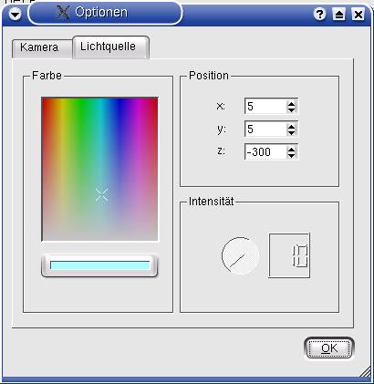 Die Eigenschaften von Lichtquelle und Kamera sind über ein Dialogfenster